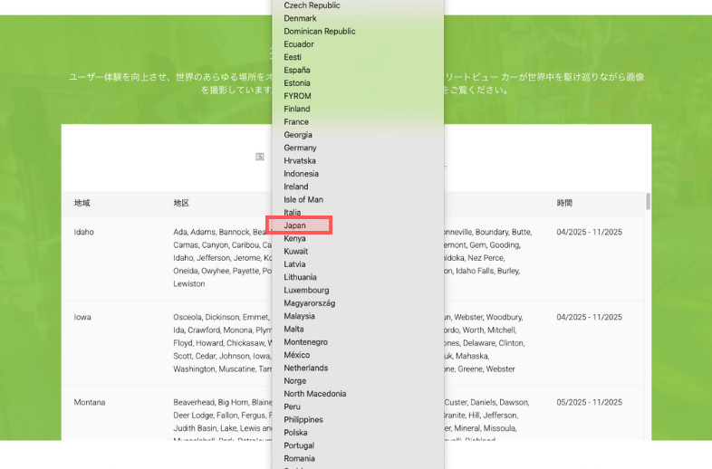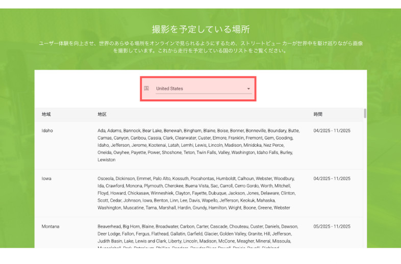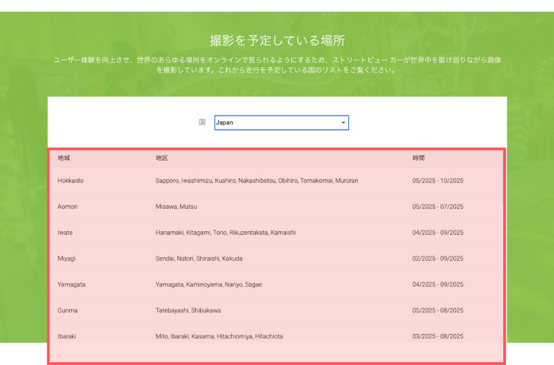 下の画像の例から、各地域のストリートビュー撮影予定が以下のように分かります。